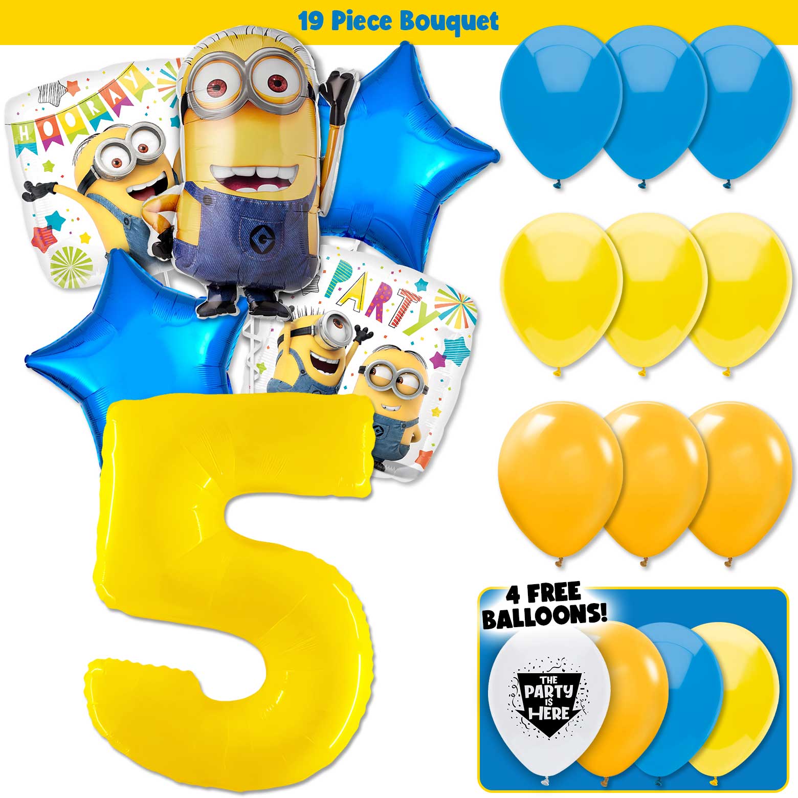 Coordinate with other Minions products! The balloon bouquet features Minion Shaped with a Minion Yellow and Trousers Blue color palette, simplifying the process of complementing it with party essentials like plates, napkins, and banners.